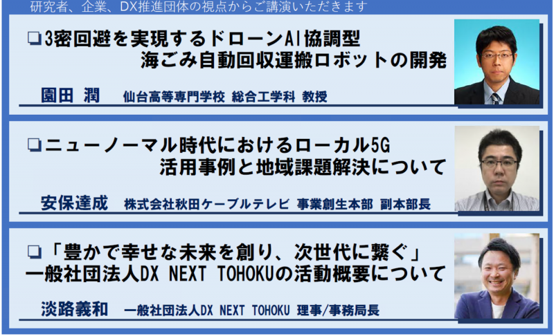 ニューノーマルで活用できる三密回避型のICT技術で東北地方の地域課題を解決した事例の発表や、新たな課題解決技術の提案。さらに、地域・産学官連携による今後の展開・発展などを討論。 - 開催日時