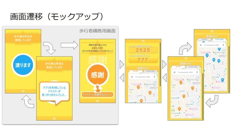 ドライバーには渡りたい歩行者がいるという通知を行うことで歩行者に気付づくよう促し、また横断歩道を渡れた歩行者からは、運転手に感謝のメッセージを送ることができる、というスマートフォンのアプリの開発を目指しました。