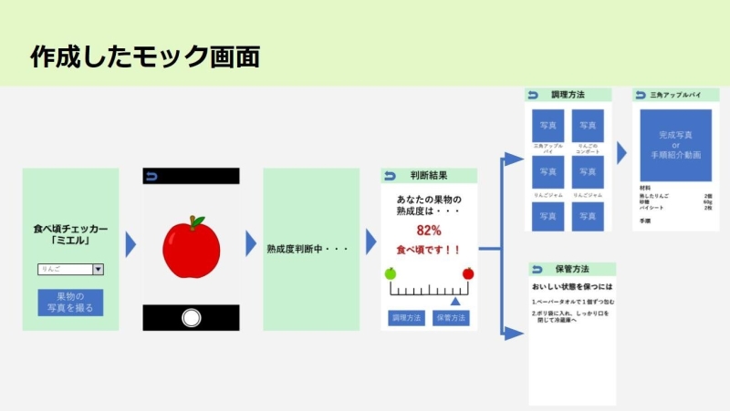学生の家族やスーパーの方へのヒアリングを行った結果、果物、特にアボカドの食べ頃が分からず、買い物に失敗したという話を聞き、外見から中身が見えず食べ頃が分かりにくい果物の熟成度が、触らずに、スマートフォンで写真を撮るだけで判別できるシステム「食べごろチェッカー ミエル」の開発に取り組みました。